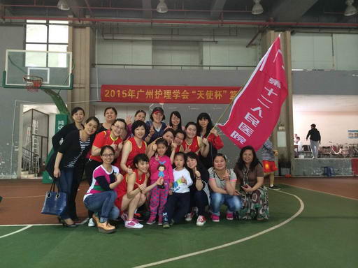 2015年3月29日,广州护理学会举办了庆祝“5.12”国际护士节系列活动——“天使杯”篮球赛。在院领导的大力支持下,我院派出了一支女队参加,参赛队伍由教练刘旭良、领队王晶、王兴君、冯海玲、代慧、杨金梅、徐永考共7人组成。这支队伍是在赛前2周甄选组建起来的,队员们在工作之余每天下午5点以后集结训练,废寝忘食,任劳任怨。比赛中她们以“十二、十二,奋勇拼搏”为口号,竭尽全力,奋勇拼搏,不畏艰难,坚持不懈。以赖晓帆副主任、孙丽敏、林玉秀、丁晶荣、吴增芝、李志彬、倪丹霞等护士长们带头组成的啦啦队也在现场为队员们递水擦汗,呐喊助威。